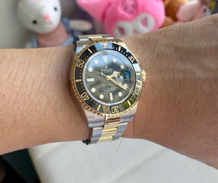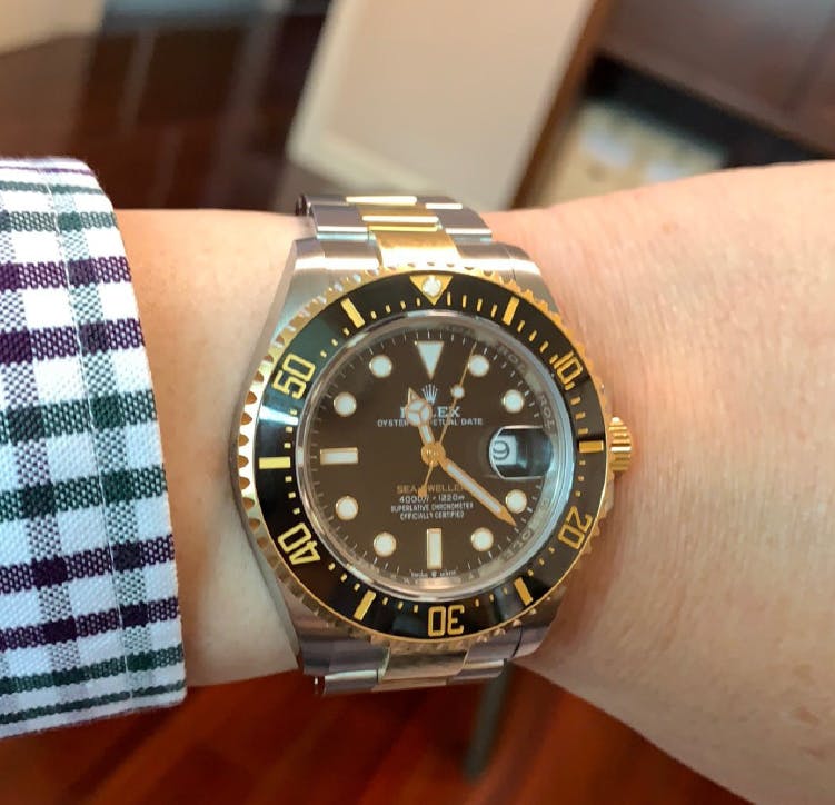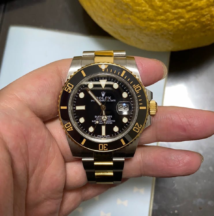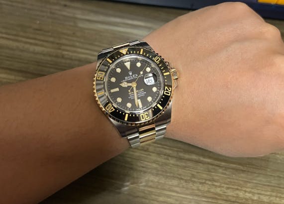 สาย: Oyster สามข้อ สลับทอง พร้อม Oysterlock ล็อกนิรภัย และระบบปรับขยาย Glidelock